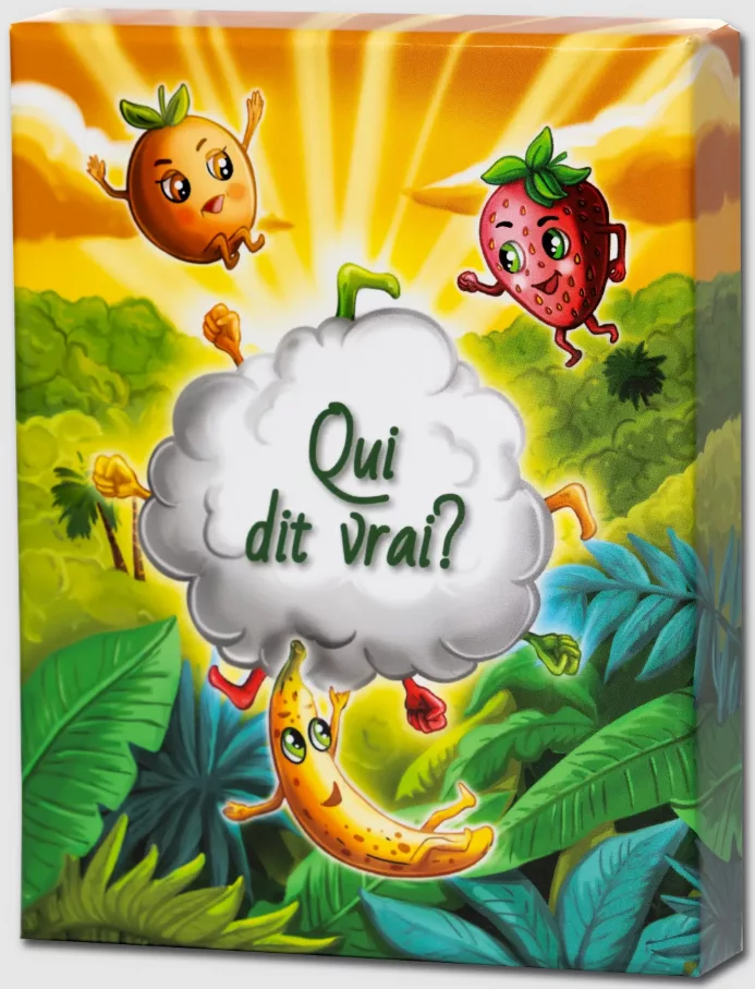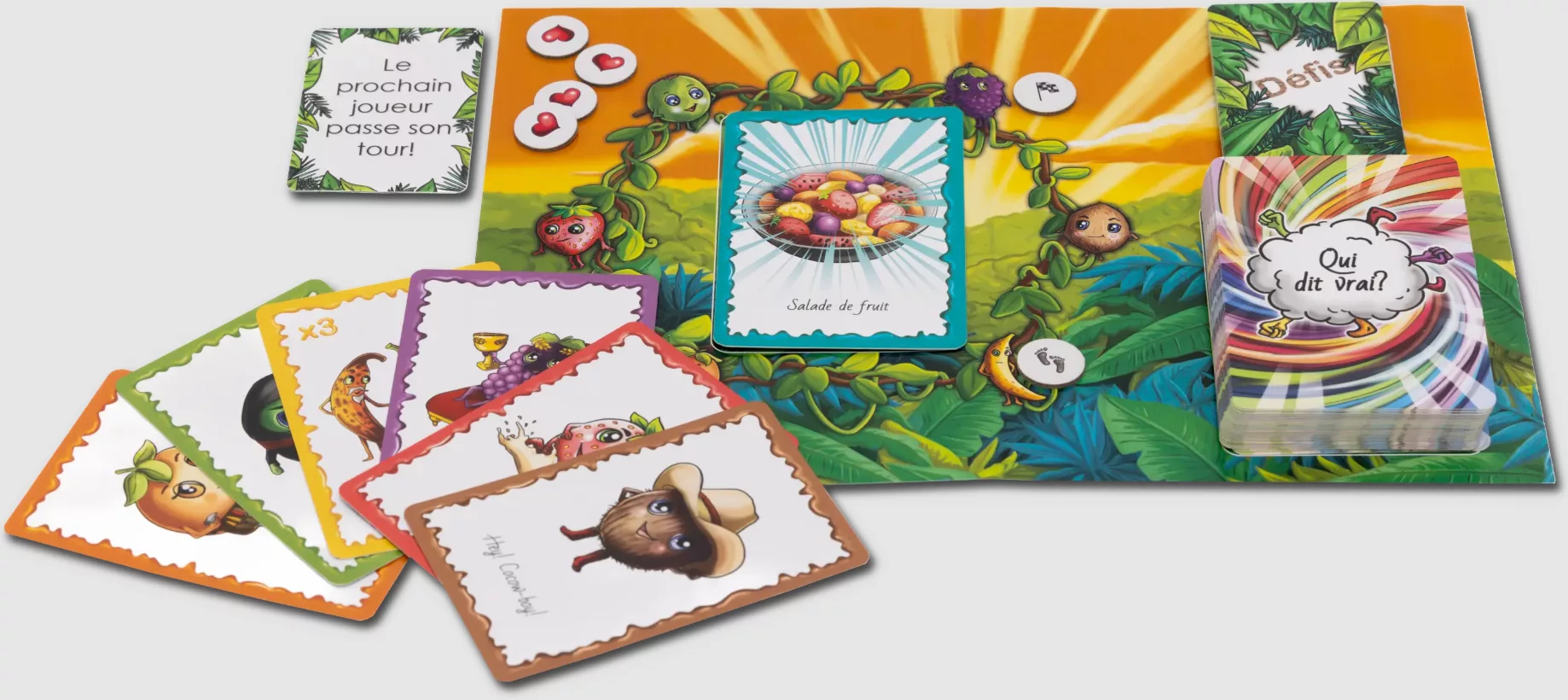 Voici une salade de fruits dans laquelle s’entremêlent bluff, mensonge et vérité ! Dans ce jeu coloré, défiez vos amis en pariant toujours plus haut sur le nombre de bananes, noix de coco, fraises (et bien d’autres) présentes dans toutes les cartes en jeu. Mais attention, au risque de perdre vos points de vie… Qui dit vrai ?